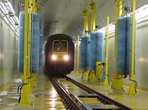 鐵路列車自動(dòng)清洗機(jī)可實(shí)現(xiàn)對列車車廂、火車頭等外面進(jìn)行全面、徹底的自動(dòng)清洗,設(shè)備主要由噴淋系統(tǒng)、洗刷系統(tǒng)、干燥系統(tǒng)、水處理系統(tǒng)(選配)、預(yù)警系統(tǒng)及控制系統(tǒng)等組成,可通過噴淋濕潤、預(yù)備洗刷、洗滌洗刷、漂洗洗刷和吹掃干燥等不同的清潔方式,配合列車勻速通過清洗工作場地除去列車表面的塵埃和污垢,達(dá)到運(yùn)營列車潔凈要求。[查看詳情]